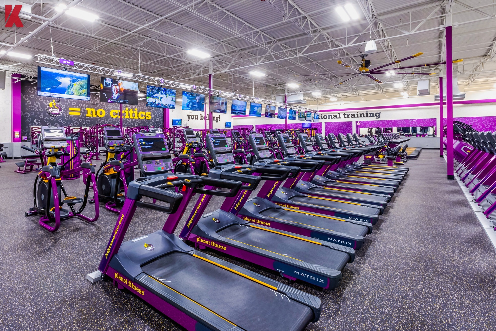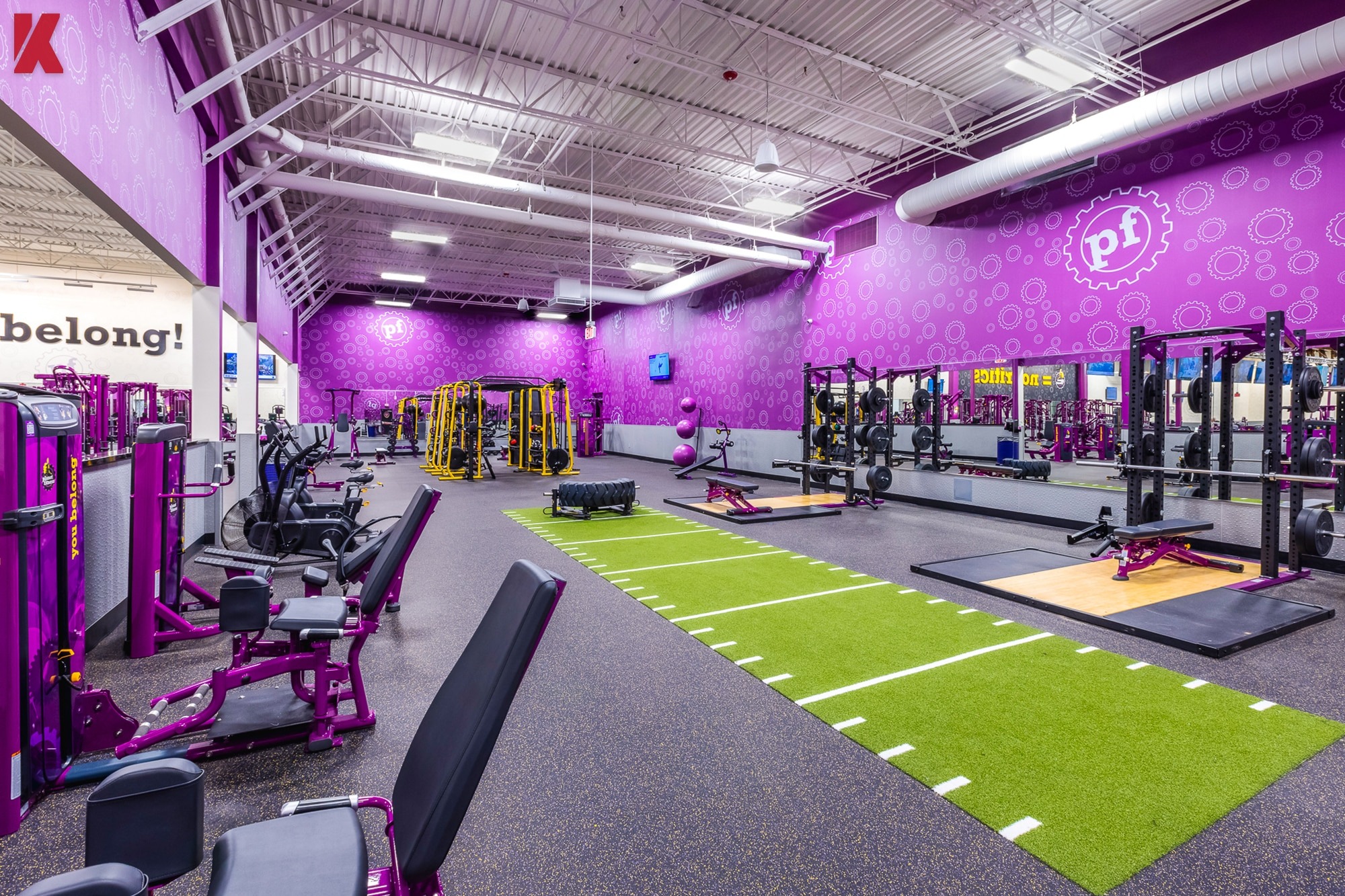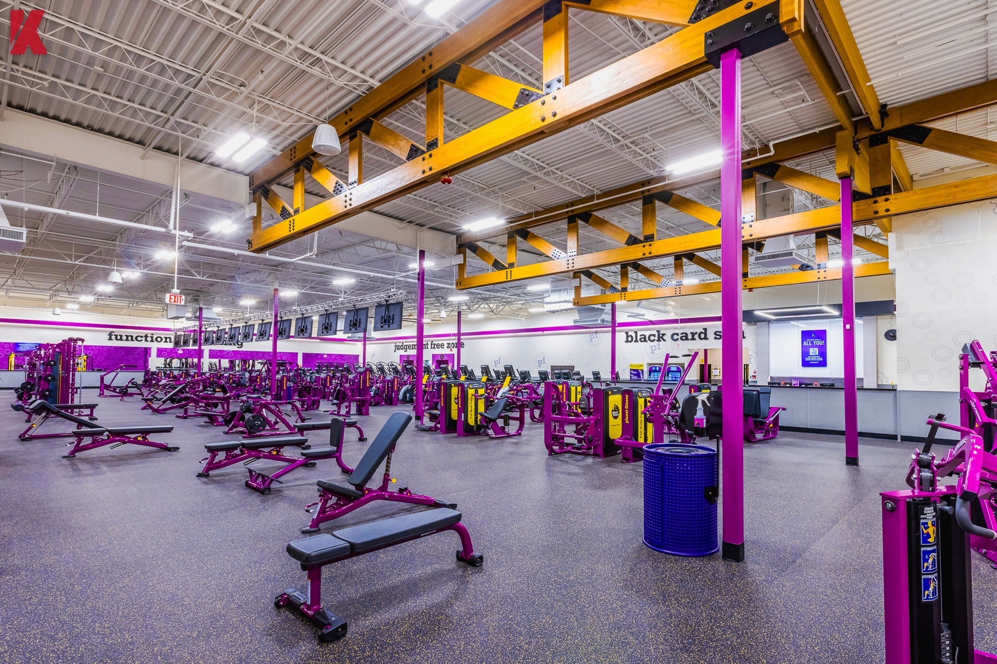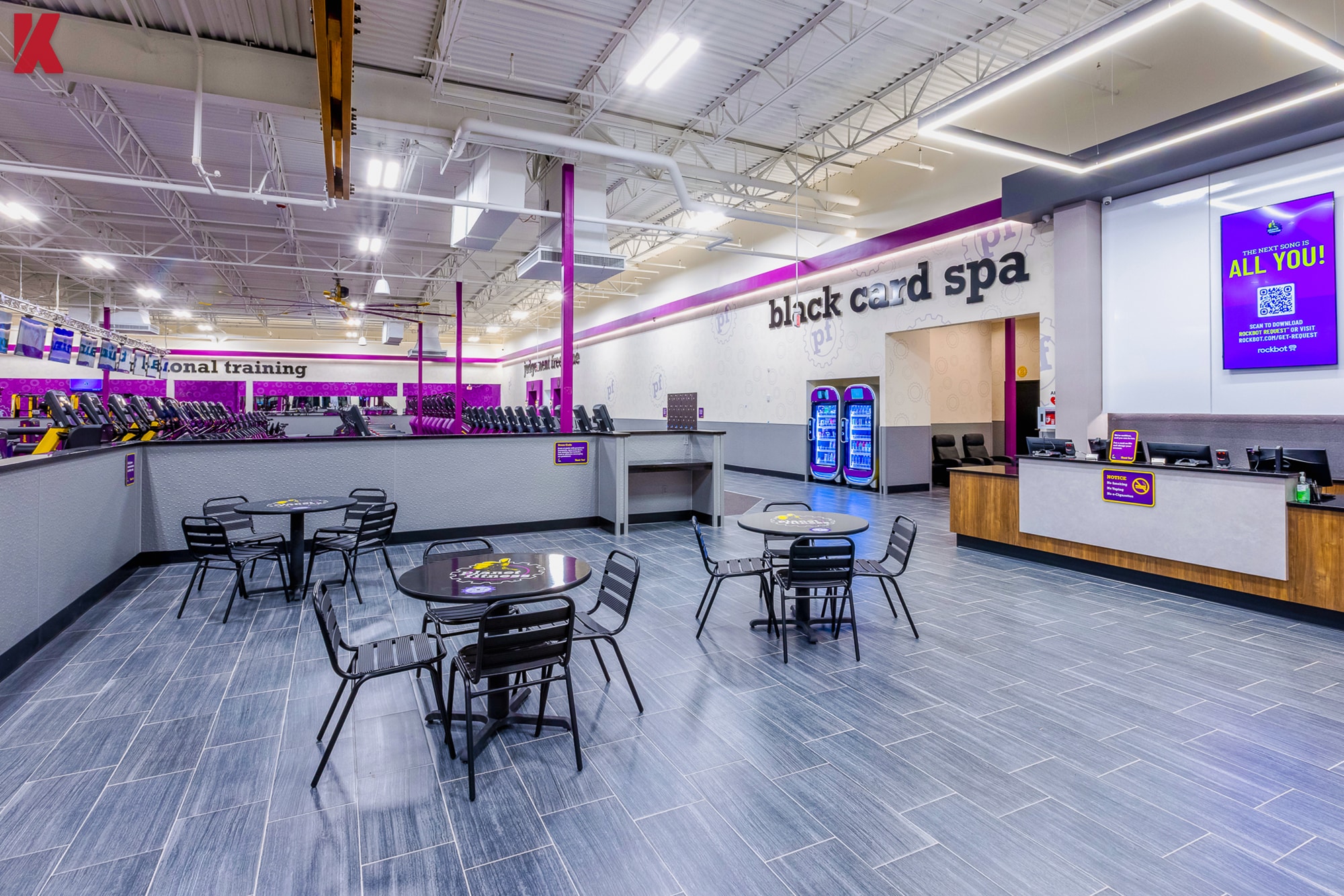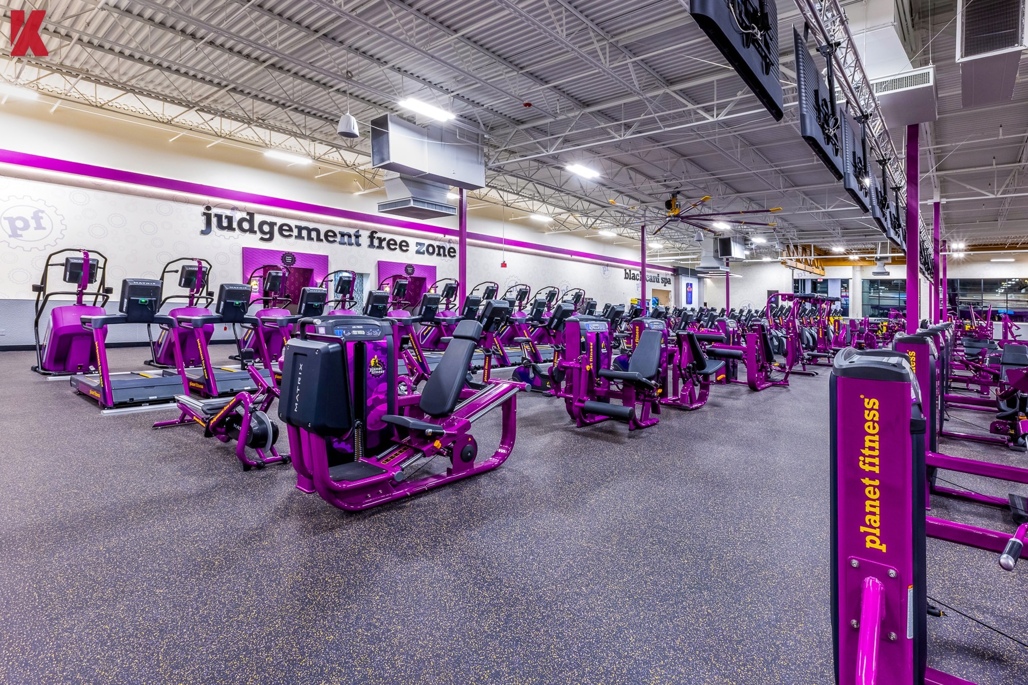 The project included full interior demolition, reconstruction, and upgraded building systems to support Planet Fitness brand standards. The finished space features an open workout floor, PF360 turf zone, cardio and strength training areas, the Black Card Spa, tanning rooms, locker rooms, and supporting back-of-house spaces that enhance both member flow and operational efficiency.